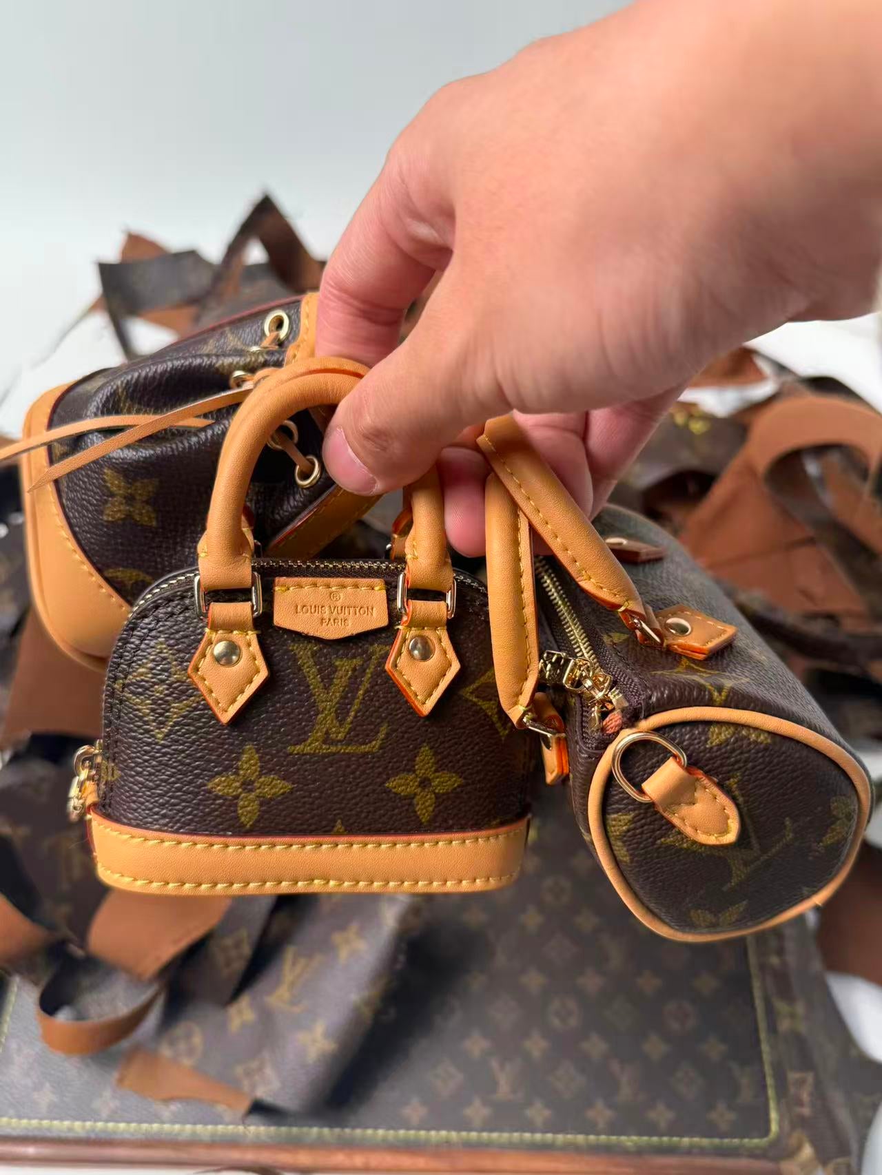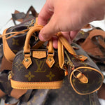 This Bag Charm Set consists of a Micro Speedy, a Micro Alma, and a Micro Noe. It comes with a strap and a chain, allowing you to attach all three charms to the strap and wear it as a crossbody bag. Each charm can also be detached and used individually to accessorize your own bags. This set is faithfully crafted based on the Trio Mini Icons design.